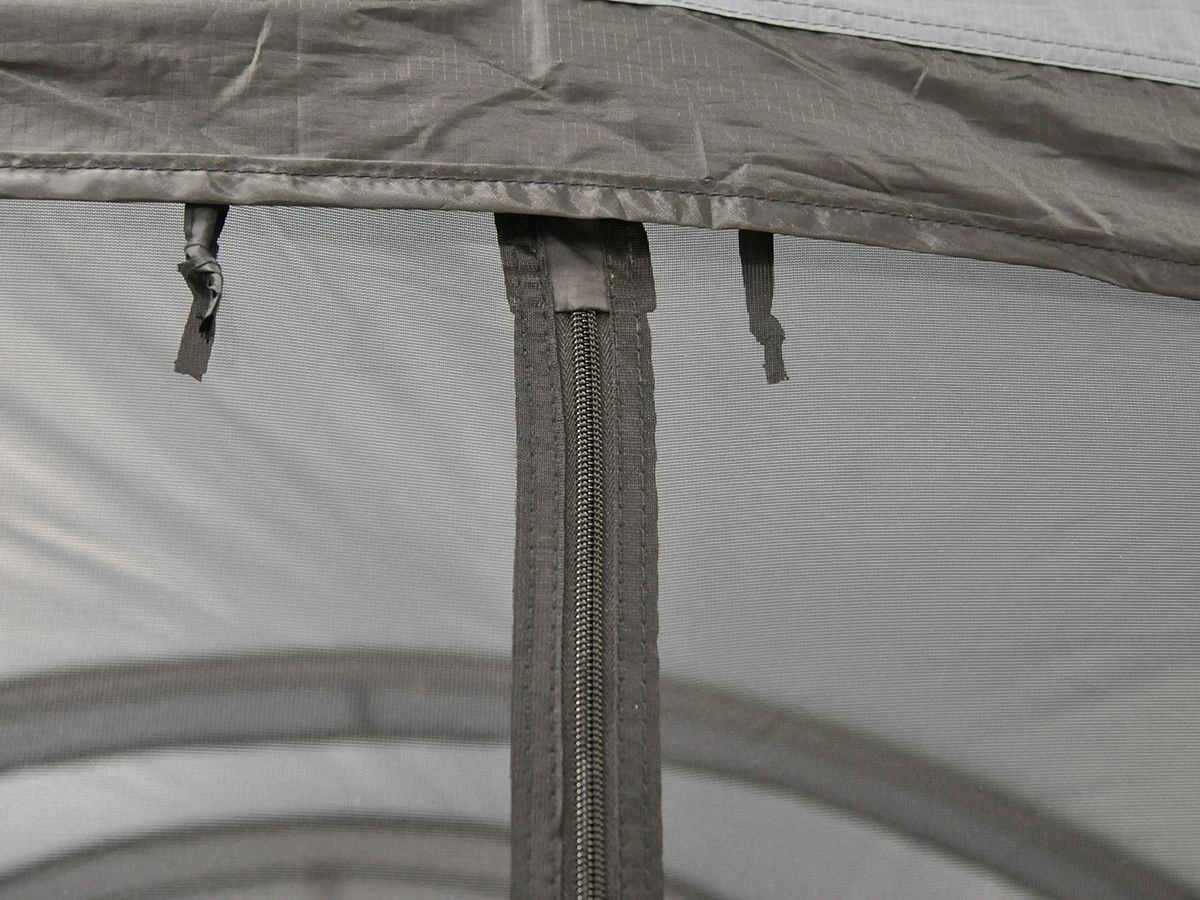 De gaaswand is voorzien van een ritssluiting en kan op beide ritsen die in de tent zitten gemonteerd worden. Zo kun je er zelf voor kiezen of je de gaaswand helemaal vooraan, of halverwege de tent plaatst. Omdat de tent voorzien is van twee ritsen kun je de gaaswand ook tegelijk met de vaste voorwand van de tent gebruiken.