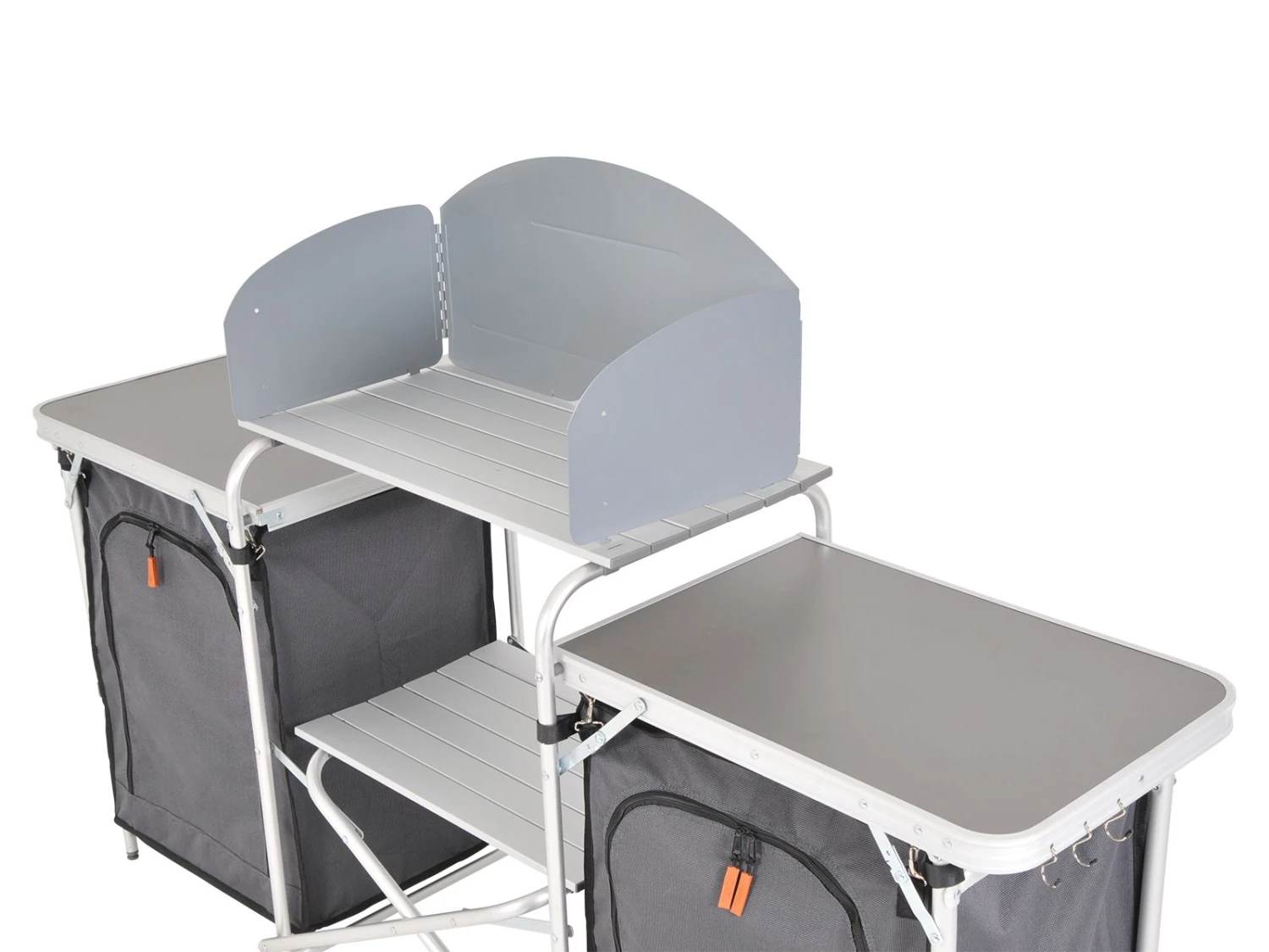 Het kookgedeelte is voorzien van een windscherm, dit voorkomt dat het vlammetje van je kooktoestel uitwaait. Het windscherm is te gebruiken bij een kooktoestel met een maximale afmeting van 61 x 31 cm. Heeft je kooktoestel al een windscherm? Dan kun je het windscherm eenvoudig van de campingkeuken verwijderen.
