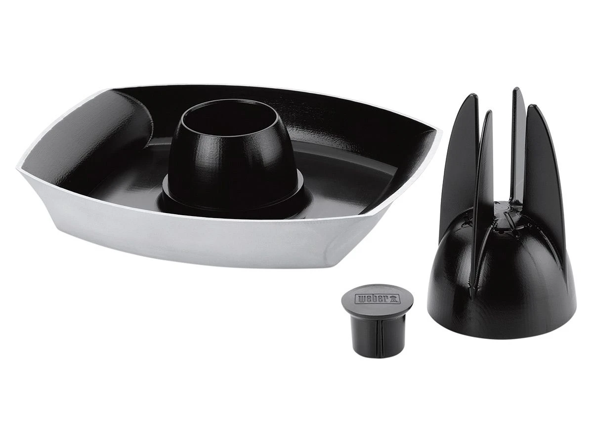 De Weber gevogeltestomer bestaat uit een schaal met anti-aanbaklaag, houder en kap. Voor de perfecte bereiding van gebakken kip of ander gevogelte. Geschikt voor alle brikettenbarbecues vanaf 57 cm en gasbarbecues vanaf de Weber Q 300.